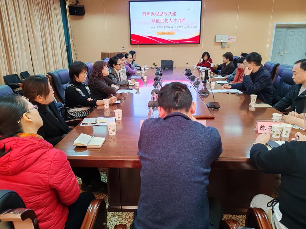 11月13日下午,马克思主义学院与生命科学学院在科研楼502会议室联合举办“课程思政与思政课程同向同行”座谈会。马克思主义学院党委书记、课程思政研究指导中心主任郑艳菊、教学副院长许宁、教研室主任王曼、教学督导田鸿雁等一行9人参会。生命科学学院党委书记林鹏、教育部课程思政示范教学团队负责人康现江、教研室相关负责人、骨干教师代表参加座谈会。双方围绕如何将思想政治教育元素有机融入专业课程教学实现知识传授与价值引领的深度融合展开了深入交流与探讨。