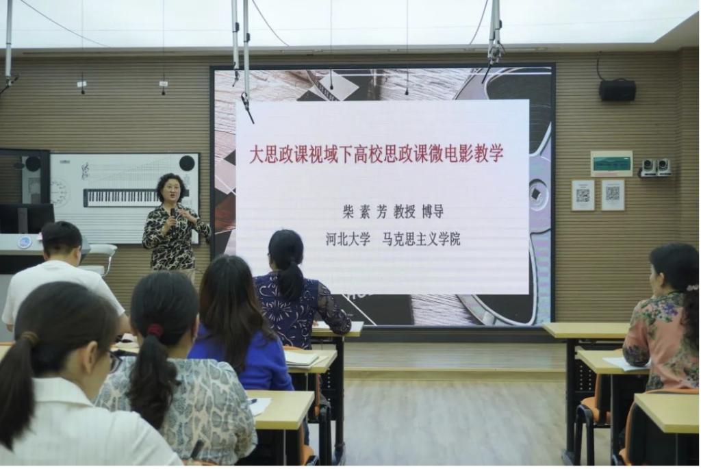 其次,柴素芳教授以《“大思政课”视域下高校思政课微电影实践教学探索》为主题做专题报告。她解读了“大思政课”的含义,分析了教育部、中宣部等十部门《全面推进“大思政课”建设的工作方案》对于思政课实践教学的指导意义,回顾了我校思政课实践教学的方式变迁,分享了她带领学院老师们开展“思想政治理论课社会实践”课程改革的艰辛历程与幸福体验。她以指导学生拍摄的微电影《西淀灯火》为例,详细介绍了我校“思想政治理论课社会实践”课的开课背景、课程目标、发展历程、解决问题、教学环节、四项要求、九多成果和发展前景。她指出,我校师生共同参与思政课微电影教学的过程,就是切实推进“大思政课”建设的过程,实现了“滴灌式”思政育人目标,促使大学生将所学理论入脑入心入行动。