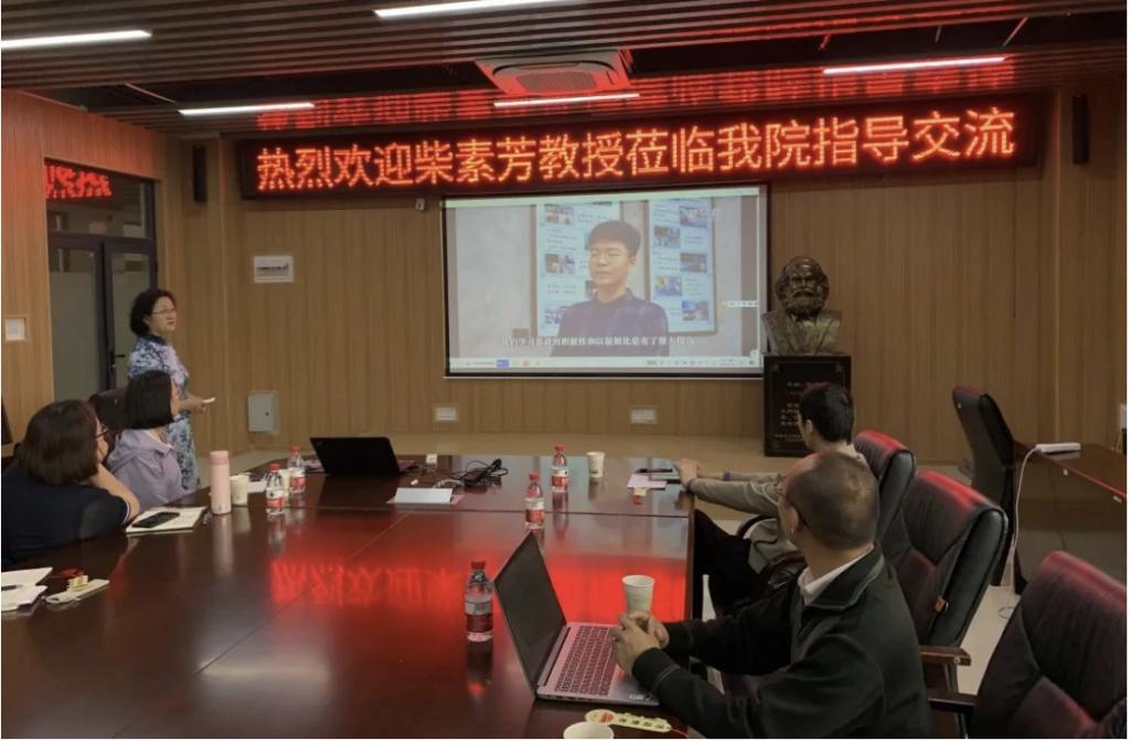 其次,在上午的研讨活动环节,柴素芳教授以《“大思政课”背景下高校思政课微电影实践教学探索》为主题进行分享。她立足习近平总书记关于“大思政课”的重要指示精神,提出“大思政课”的本质属性就是实践性,思政课实践教学是理论教学的必要补充和延伸。因此,提升思政课实践教学质量,是加强思政课建设,提升思政课育人目标的重要举措,实践教学是“大思政课”建设的重要抓手。她以指导学生拍摄的微电影《西淀灯火》为例,详细介绍了我校“思想政治理论课社会实践”课的开课背景、课程目标、发展历程、解决问题、教学环节、四项要求、九多成果和发展前景。会后,柴教授向王院长等人赠送了我校“思想政治理论课微电影教学成果丛书”《高校思想政治理论课微电影教学理论与实践研究》和《高校思想政治理论课优秀微电影应用研究》。