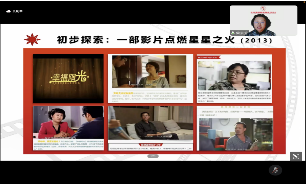 其次,柴素芳教授以《以微电影为载体增强网络思想政治教育亲和力与实效性》为主题做培训报告。柴教授以“网络思政”为切入点,回顾了我校思政课实践教学的方式变迁,分享了她带领学院老师们开展“思想政治理论课社会实践”课程改革的艰辛历程与幸福体验。她以微电影《幸福阳光》《西淀灯火》为例,详细介绍了她带领团队在“思想政治理论课社会实践”教学中运用微电影教学法对大学生进行思政教育的10年经历与丰厚成果。柴教授表示,我们正切实地应用“国家级虚拟教研室”“北京高校思想政治理论课平台”等网络平台助力河北省高校网络思想政治工作发展。她指出,我校师生共同参与思政课微电影教学的过程,就是切实推进“网络思政”建设的过程,实现了“滴灌式”思政育人目标,促使大学生将所学理论入脑入心入行动。随后,第四届“河北大学幸福微影社”社长、硕士生郭宏达以及第五届“河北大学幸福微影社”副社长、本科生刘仕茂分别介绍了微电影教学与网络思政工作相结合、河北大学“幸福微影社”助力网络思政工作的实践经历、优秀微电影作品《西淀灯火》的拍摄历程和育人理念。