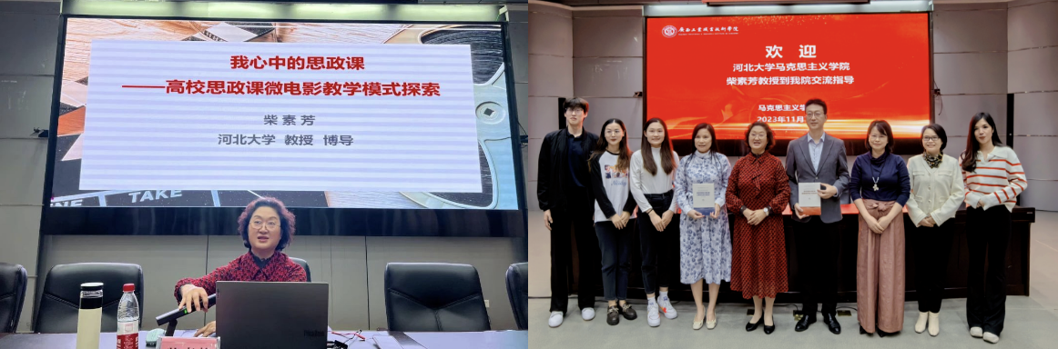 11月7日下午,柴教授在广西工业职业技术学院马克思主义学院作专题报告,该校全体思政课教师以及广西经贸职业技术学院部分思政课教师共100余人参会。报告会由院长司阳主持。讲座结束后,柴教授及参会教师观摩该校思政课教师指导学生创作的两部微电影,她对两部微电影的思想内涵、艺术表达和技术呈现等方面进行评议,并对“微电影如何与思政课衔接”“如何从微电影的角度讲好中国故事”“如何运用电影镜头进行情感表达”等问题提出建议。最后,马克思主义学院司阳院长作会议总结:“柴教授以其资深的从教经历和丰富的实践经验,为我们讲述了她对思政教育教学工作的深刻认识和理解;以其对思政育人工作的热情执着和责任担当为我们诠释了一名思政人的情真意切和师者情怀;以名师高徒、桃李天下的累累硕果让我们体会到了师者的‘幸福阳光’。她以躬身教坛的职业操守和改革当时、创新有我的精神,开创了思政微影教学的先河,促成了‘领航计划’的广泛传播和深远影响,对学院教师的教育教学和青年学生的成长成才给予深刻启迪,成就全国知名专家学者的同时,成为一众思政课教师的心中偶像和学习榜样。柴教授以‘我心中的思政课’为题,有利于激发学院教师们‘用力、用心、用情’讲好思政课的热情,她的授课内容为提升思政课教学的亲和力与实效性提供了参考范式,为高校‘大思政课’的教育教学工作提供了创新思路、方法和路径。学院的老师们经过柴教授的真传实教、悉心指导,都能启智明心、有所受益。”会后,柴教授与参会教师们共同参观了该院红色实践教育基地“党史展馆”,并围绕“思政课实践教学”“微电影教学”等问题展开深入研讨。