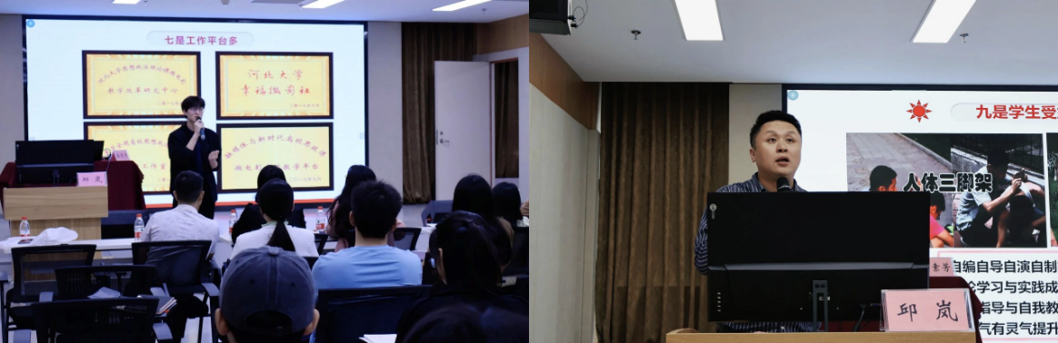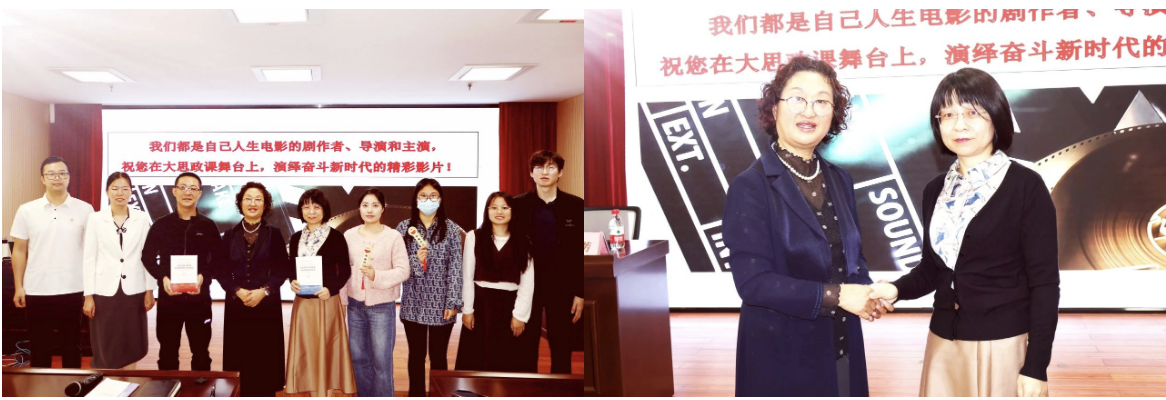 柴素芳教授以《我心中的思政课——高校思政课微电影教学模式探索》为题为三所高校作主旨报告。她以新时代思政课实践教学的重要性为切入点,结合《全面推进“大思政课”建设的工作方案》解读了“大思政课”的多重内涵。她以指导学生拍摄的微电影《幸福阳光》《西淀灯火》为例,介绍了我校“思想政治理论课社会实践”的开课背景、课程目标、发展历程、解决问题、教学环节、实践要求、九多成果和发展前景,分享了我校思政课实践教学改革的历程和经验。期间,她的硕士研究生、河北大学“幸福微影社”社长肖敬寒结合自身经历,分享了参与思政课微电影教学的成长和收获。报告会结束后,柴素芳教授分别向三所学校赠送了我校“思想政治理论课微电影教学成果丛书”——《高校思想政治理论课微电影教学理论与实践研究》《高校思想政治理论课优秀微电影应用研究》。