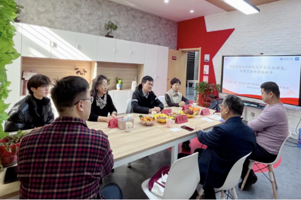 2023年12月20日上午,教育部高校思想政治理论课教学指导委员会“形势与政策”分教学指导委员会副主任委员,全国高校思想政治教育研究会学术委员,《思想教育研究》期刊常务副主编彭庆红教授,北京科技大学马克思主义学院刘明言老师莅临河北大学“融媒体与新时代高校思政课微电影教学基地”调研并指导工作,我校马克思主义学院院长、博士生导师王海教授,思政课微电影教学改革研究中心副主任王华玲副教授和办公室主任李慧娟老师陪同调研,河北大学“幸福微影”学生团队进行介绍。